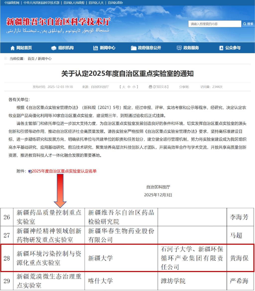 近日,新疆维吾尔自治区科学技术厅正式公布2025年度自治区重点实验室认定名单,由新疆大学牵头,联合石河子大学、新疆环保循环产业集团有限责任公司等行业龙头单位共建的“新疆环境污染控制与资源化重点实验室”成功获批。这是新疆首个环境污染控制领域自治区重点实验室(以下简称“实验室”),标志着新疆环境学科科研平台建设实现重大突破。实验室由新疆大学生态与环境学院副院长(主持行政工作)黄海保教授担任主任,中国工程院汪华林院士担任学术委员会主任、中国工程院贺泓院士等担任学术委员会副主任。