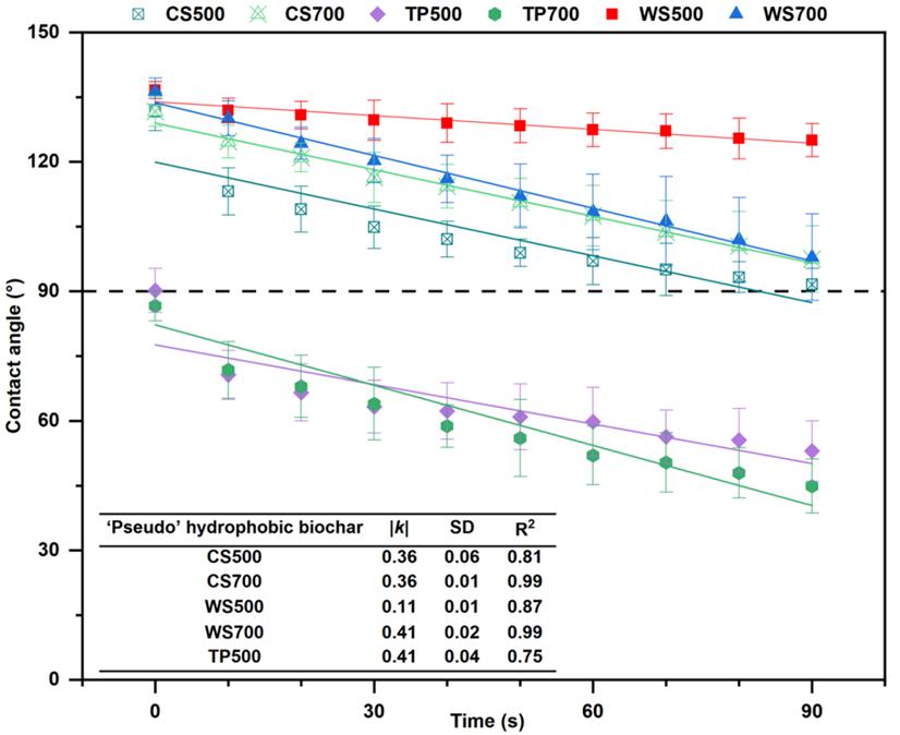 该研究通过17种标准材料和18种生物炭的系统测试,提出动态接触角(DCA)法,追踪90秒内接触角变化,并引入“假性疏水”概念。研究发现铁屑和中高温生物炭初始接触角大于90°,瞬时疏水性较强,但90秒后显著降至90°以下,持久疏水性较弱。为了统一瞬时疏水和持续疏水两个评价维度,研究提出以初始接触角、90秒接触角与接触角变化率(|k|)组合作为疏水性评价准则,建立了包含超疏水、强疏水、“假性疏水”和亲水四类的疏水性评价新分类标准,并将DCA法和新的评价标准引入了土壤疏水性评价中。土壤孵育实验结果表明,生物炭对土壤疏水性的调控具有剂量效应和时间效应,1%(wt%)生物炭添加即可使土壤从亲水转化为“假性疏水”和“强疏水”状态,5%添加量效果更显著。生物炭添加虽可明显提升土壤疏水性,但90天后疏水性强度均有下降,调控的持久性值得后续研究进一步关注。