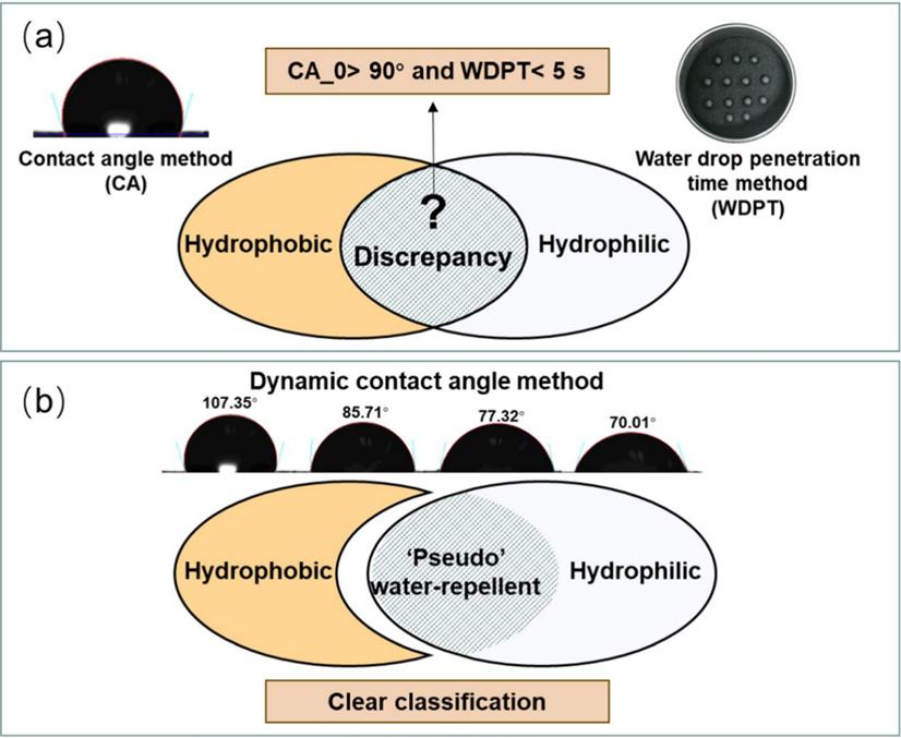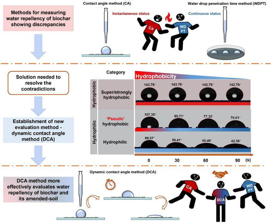 土壤疏水性的主流评价方法包括接触角(CA)法和水滴渗透时间(WDPT)法。CA法测量瞬时疏水性,而WDPT法反映持续疏水性,两者时间维度不一致导致矛盾结果频发,如部分土壤改良材料用CA法测试接触角大于90°,代表疏水,但WDPT法测试小于5秒又指向亲水,这些矛盾的梳理解决在土壤疏水性评价和土壤的水分管理研究领域属于方法学上的国际难题。