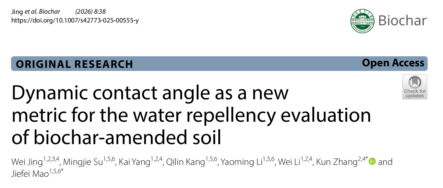 2026年2月1日,我院张坤副教授课题组在环境科学与生态学1区期刊biochar上发表题为“Dynamic contact angle as a new metric for the water repellency evaluation of biochar-amended soil”的研究论文,构建了土壤疏水性测试的新方法——动态接触角法,论文第一作者为硕士研究生敬薇,合作单位为中国科学院新疆生态与地理研究所。